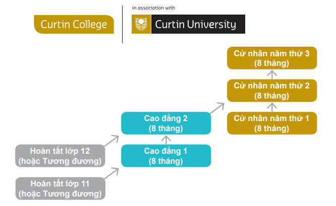 Curtin College là một chương trình Cao đẳng dành cho những sinh viên chưa đủ điều kiện đầu vào khóa chính của Đại học Curtin. Chương trình này có nội dung và cấu trúc khóa học tương tự như năm 1 của bằng đại học tương ứng của Đại học Curtin. Hoàn thành Văn bằng Cao đẳng Curtin sẽ giúp bạn nhập học trực tiếp vào năm 2 của chương trình cử nhân Đại học Curtin tương ứng.