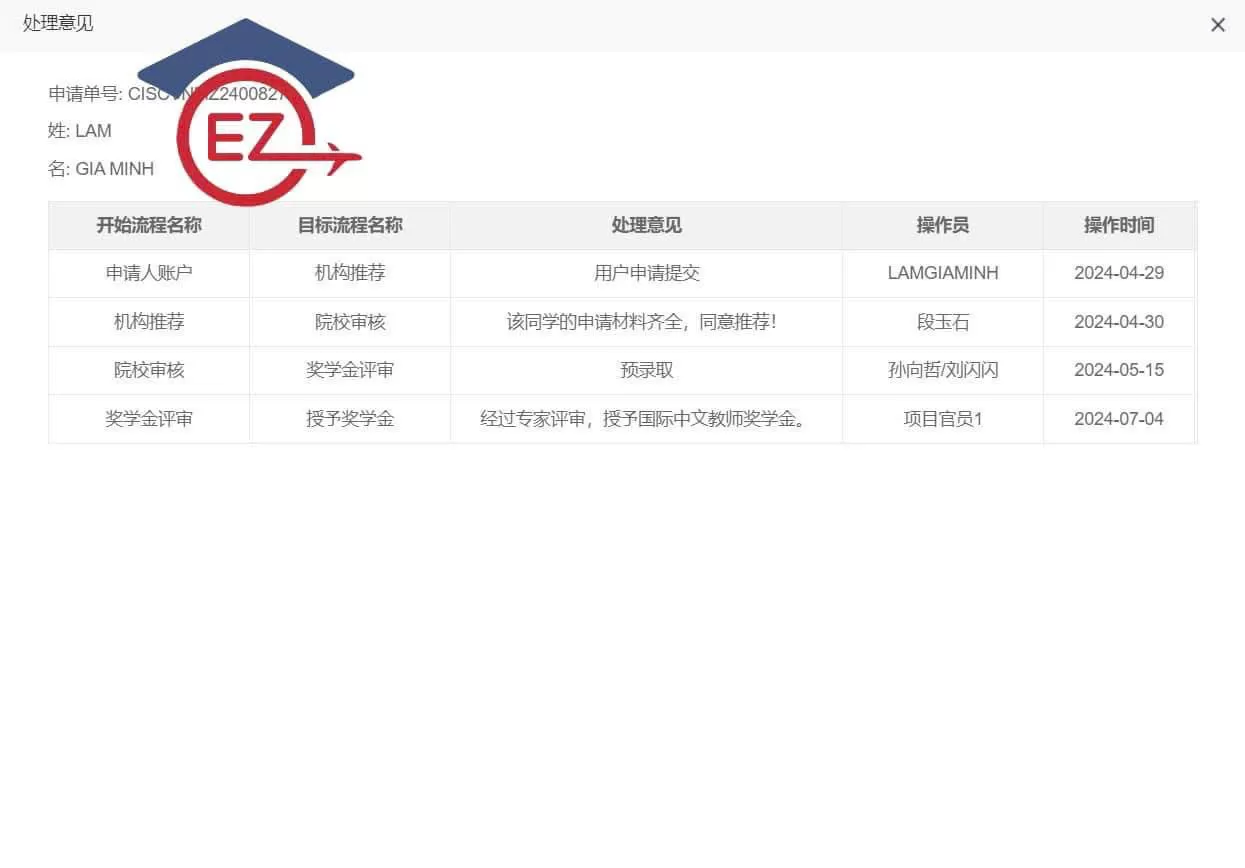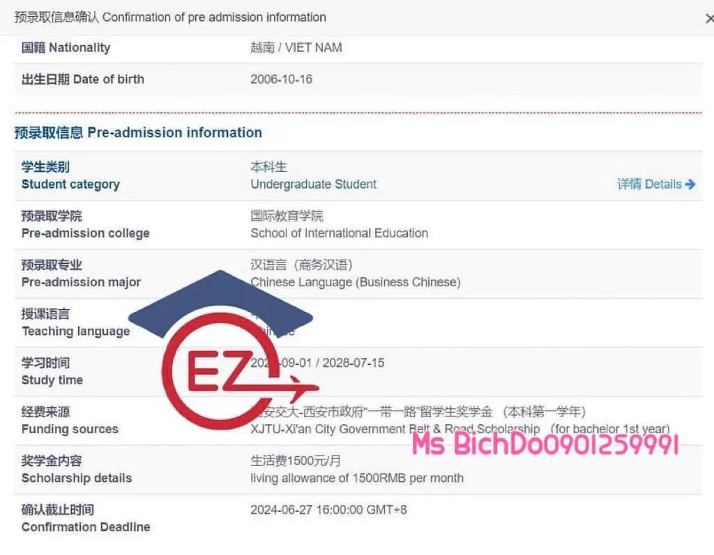 - Vì tham khảo 1 số trung tâm nên mãi tới tháng 1/2024, tức là còn 2 tháng là hệ thống CIS mở, Gia Minh mới liên hệ MENTOR học bổng của EZ Go Vietnam. Do vậy, bạn ko thể chọn được nhiều trường. EZG đã tư vấn cho bạn các trường ở Quảng Châu theo nguyện vọng của gia đình (bao gồm ĐH Quảng Châu, ĐH Ký Nam, ĐH Chính Pháp Tây Nam…). Tuy nhiên, ngay thời điểm gần đến khi hệ thống mở, vì ba Gia Minh luôn bày tỏ muốn con vào được trường tốt, nên sau buổi họp giao ban ngày thứ 2 cuối cùng của tháng 2, team EZG đã liều lĩnh apply cho bạn suất học bổng Khổng Tử của một trường top 10 và thuộc khối C9 tại Trung Quốc. Với kế hoạch học tập (KHHT) được team EZG thiết kế riêng, cùng với sự support luyện phỏng vấn vòng trường. Cuối tháng 6/2024, Gia Minh vượt qua vòng trường, và cùng lúc giành học bổng Vành đai con đường. 04/07/2024, khi nhà nhà đang ngồi trước màn hình máy tính, người người đang thấp thỏm lo âu liệu hồ sơ apply của mình có nhảy bước hay ko thì Gia Minh đã khiến cả team EZG vỡ oà sung sướng khi hệ thống thông báo nhảy bước, bạn đã đỗ học bổng Khổng Tử hệ Đại của XJTU một cách vừa may mắn vừa xứng đáng. Công sức của cả team và Gia Minh đã được đền đáp xứng đáng.