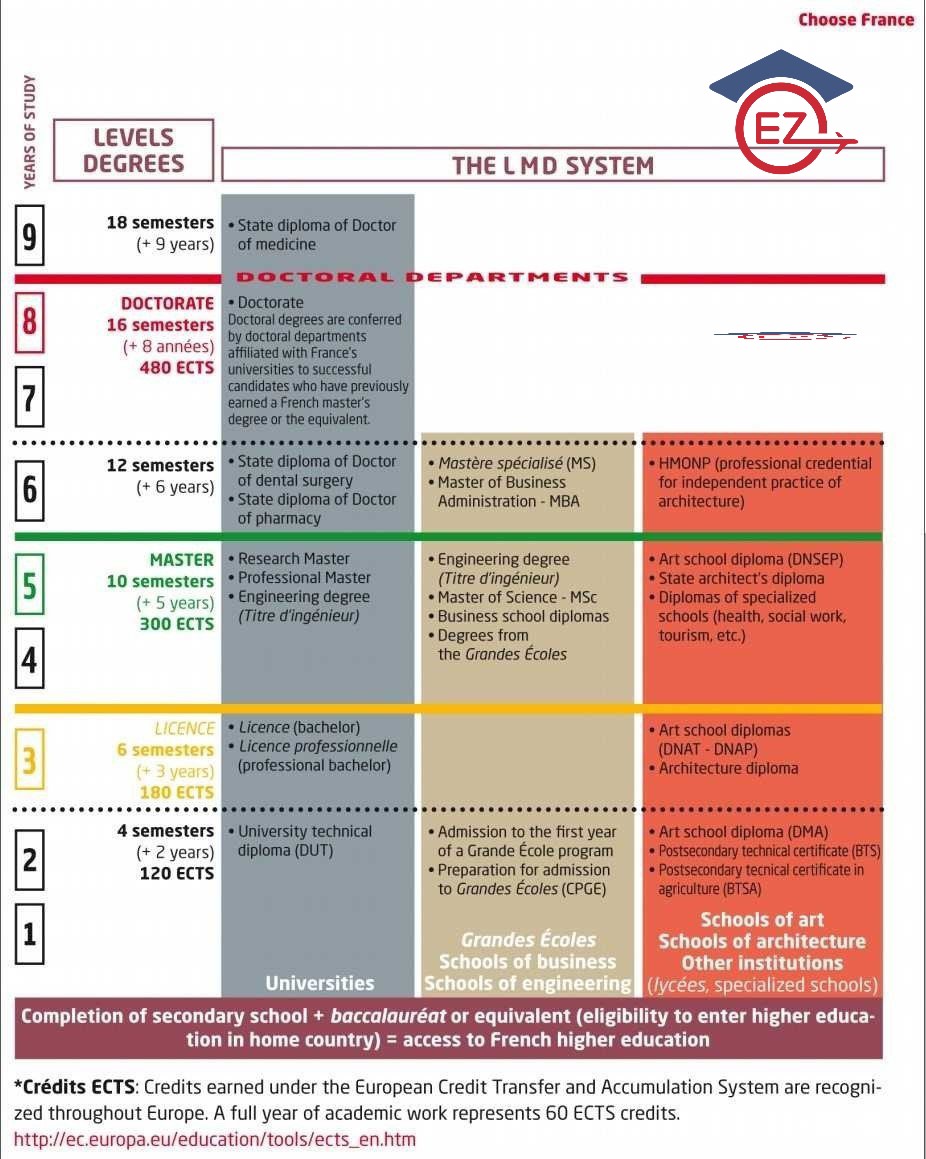 Giáo dục Đại học Pháp được cấu trúc quanh hệ thống LMD (Cử nhân – Thạc sĩ – Tiến sĩ). Phần lớn các bằng cấp của Pháp cho phép sinh viên tích lũy tín chỉ ECTS được công nhận bởi nhiều nước trong Liên minh Châu Âu và trên thế giới.