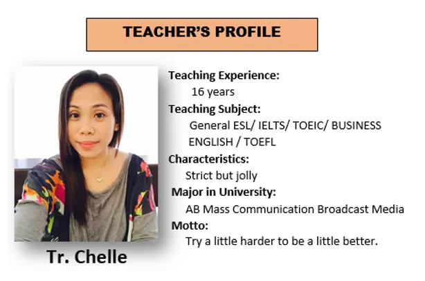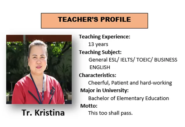 Cô Jinky - Giáo viên kỳ cựu của trường anh ngữ CPILS. Cô Jinky dạy các khoá học giao tiếp, ESL, IELTS, Business, TOEIC, TOEFL .... Với hơn 6 năm kinh nghiệm giảng dạy, cô Jinky luôn ở trong Top giáo viên được yêu thích nhất CPILS.