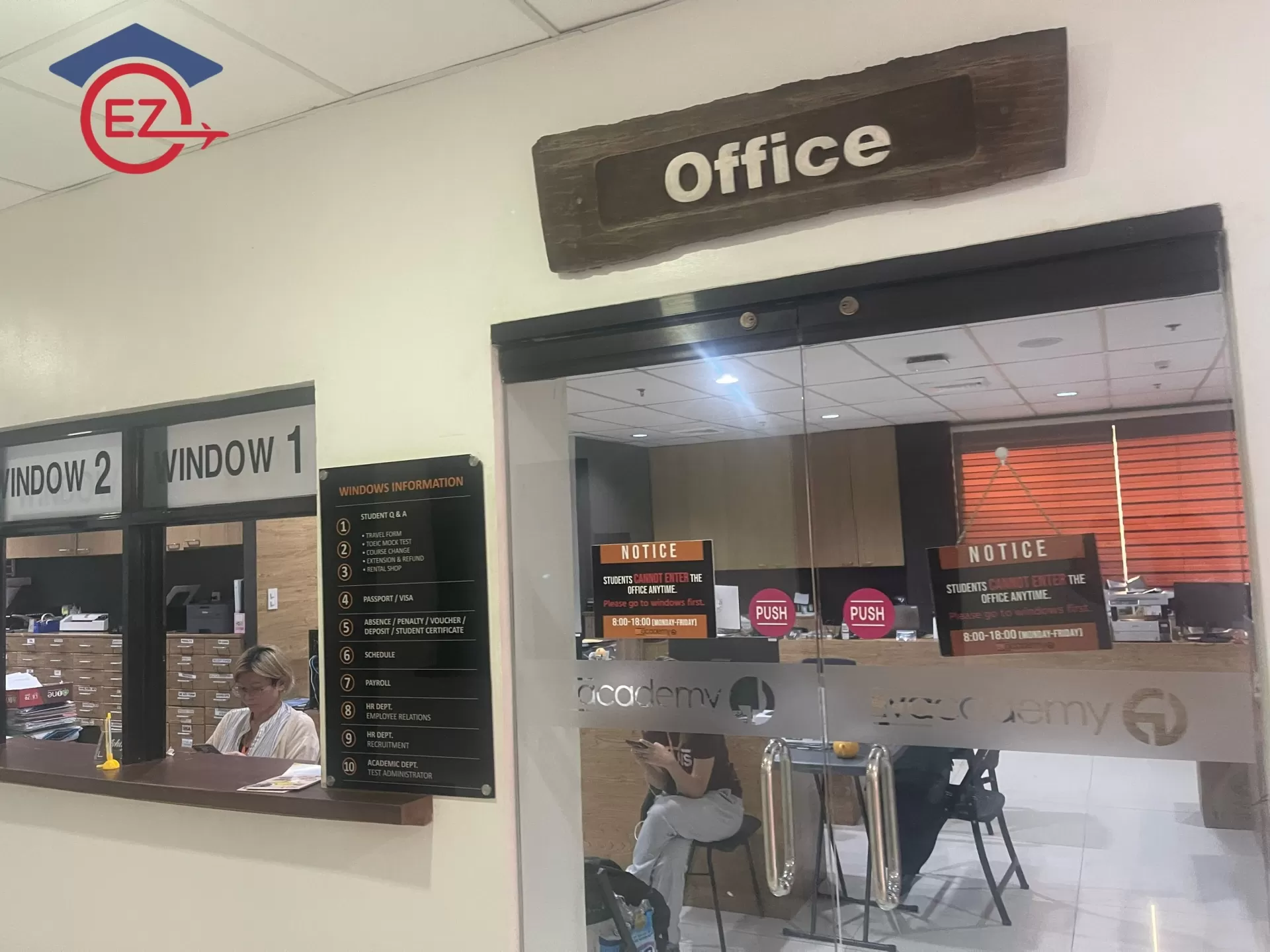 Bước vào hành lang đầu tiên là Office - nơi các bạn có thể update thời khoá biểu, đăng ký học, đổi lớp học, đăng kí đổi giáo viên, gia hạn visa... nói chung là một nơi các bạn có thể xử lý được tất cả mọi việc liên quan tới bản thân và lộ trình học của mình trong suốt khoá học.