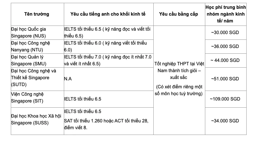 - IELTS: Mức yêu cầu thường từ 6.0 - 7.0 tùy ngành học và trường. Ví dụ, NUS yêu cầu tối thiểu IELTS 6.5, trong khi SMU yêu cầu 7.0.